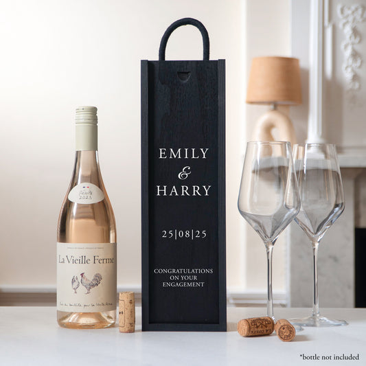 These personalised bottle gift boxes make the perfect engagement present for a newly engaged couple. Thoughtfully designed for wine and champagne, each box can be customised with names, dates, and heartfelt messages, creating a unique keepsake they’ll cherish long after the celebration.