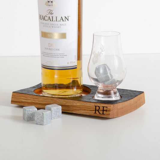 Double whisky wood flight for glass and bottle