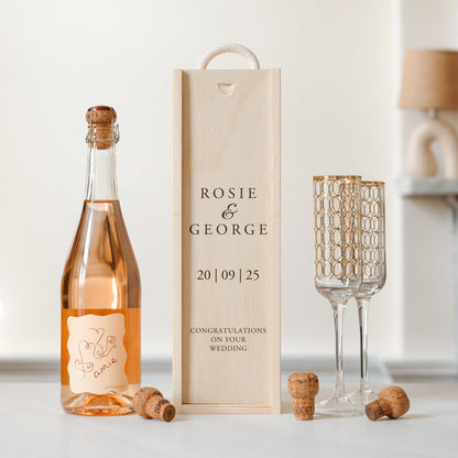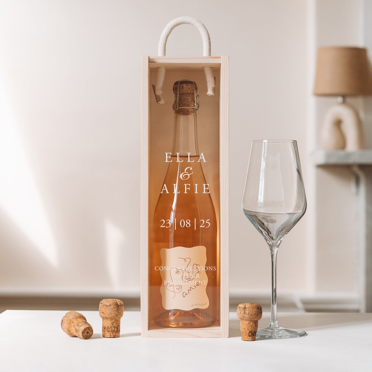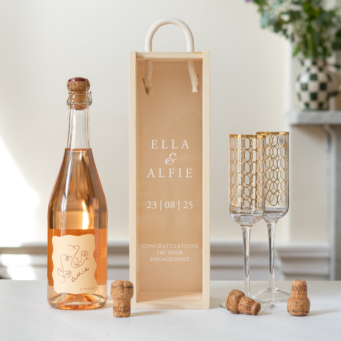 Celebrate a special moment with our personalised wooden bottle box, paired with a bottle of Amie Non-Alc Sparkling Rosé