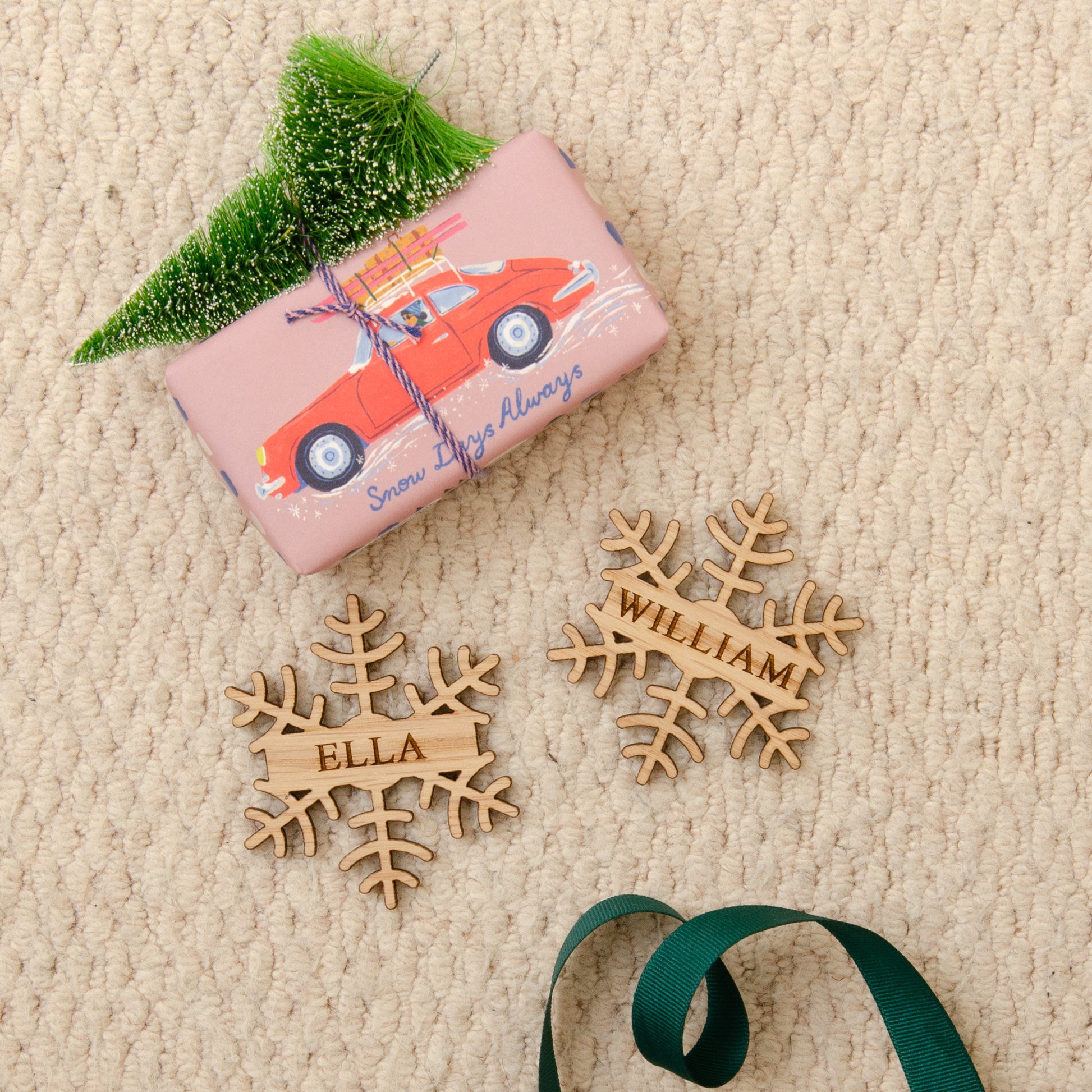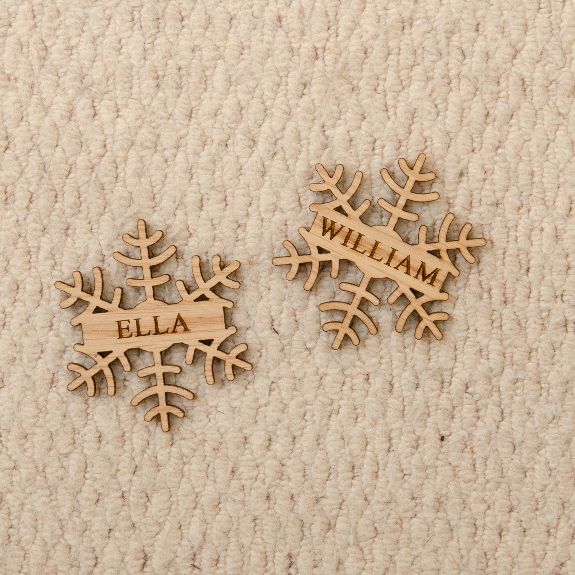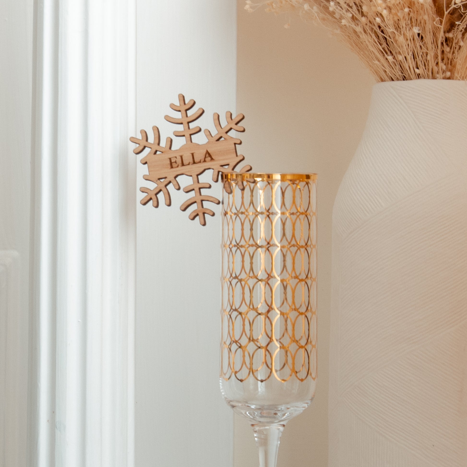 Elevate your Christmas table with our Christmas snowflake glass charm place name settings personalised with a name. These will make the perfect festive addition to any glass. A lovely set of wooden Christmas decorations.