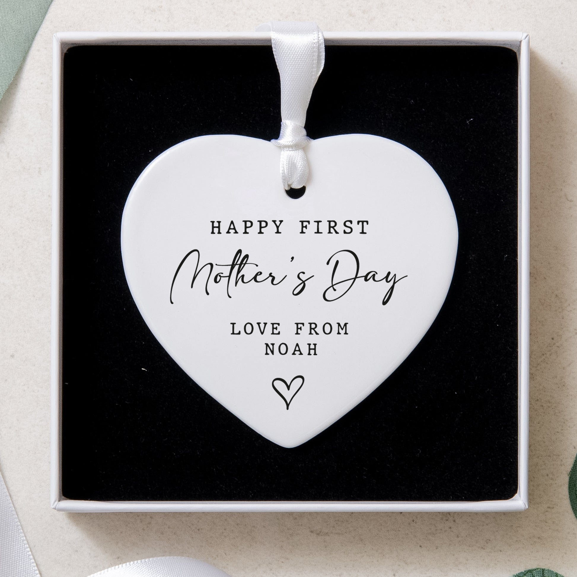 On the heart ceramic ornament as standard it will say 'Happy First Mother's Day' and a black love heart at the bottom.