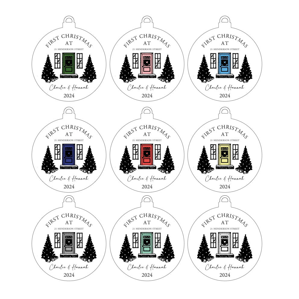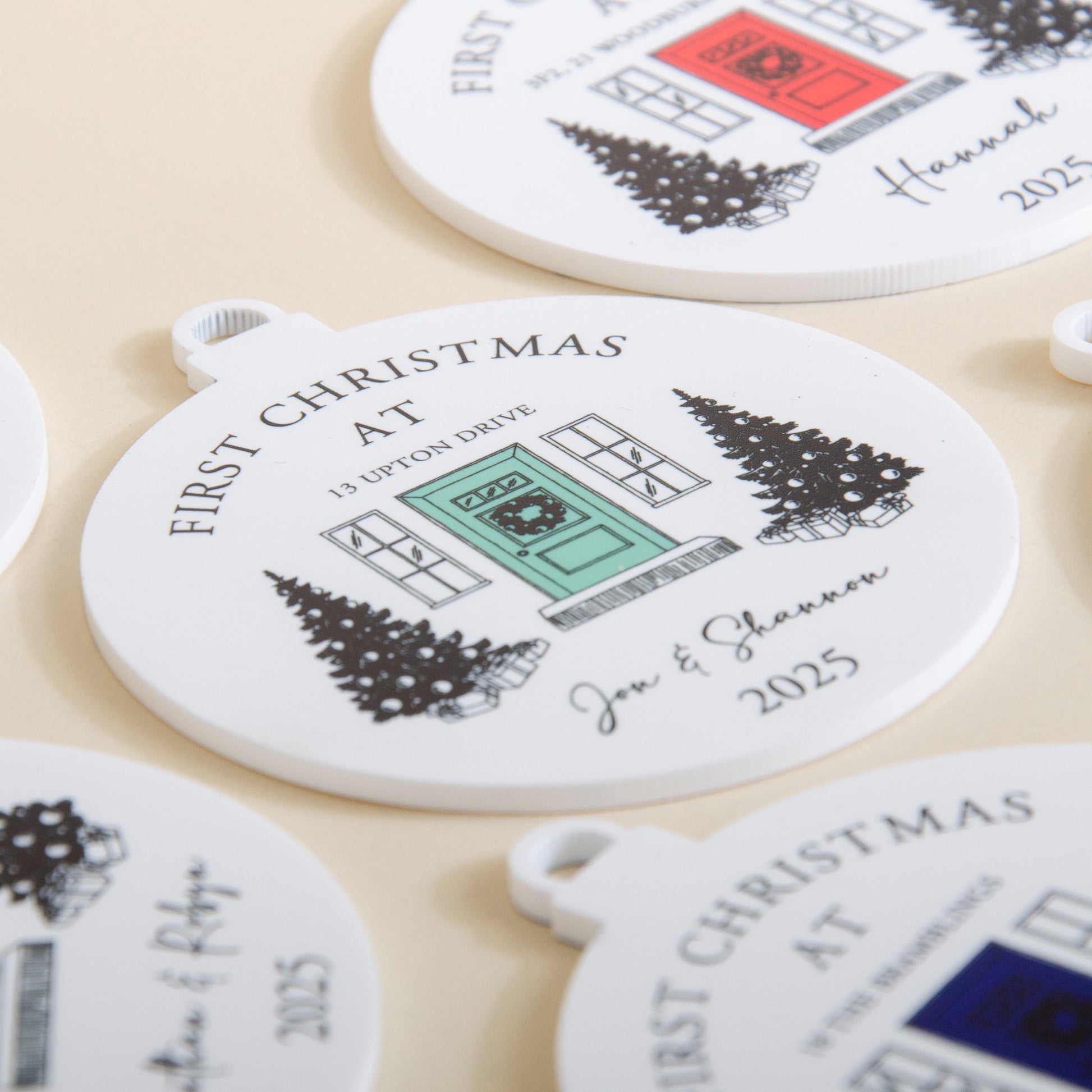 On the bauble, it will read 'First Christmas at' then space for first line of the address followed by a door and trees logo then below space for two names then '2025' engraved beneath. 2025 will be printed as standard but you can ask for it to be removed.