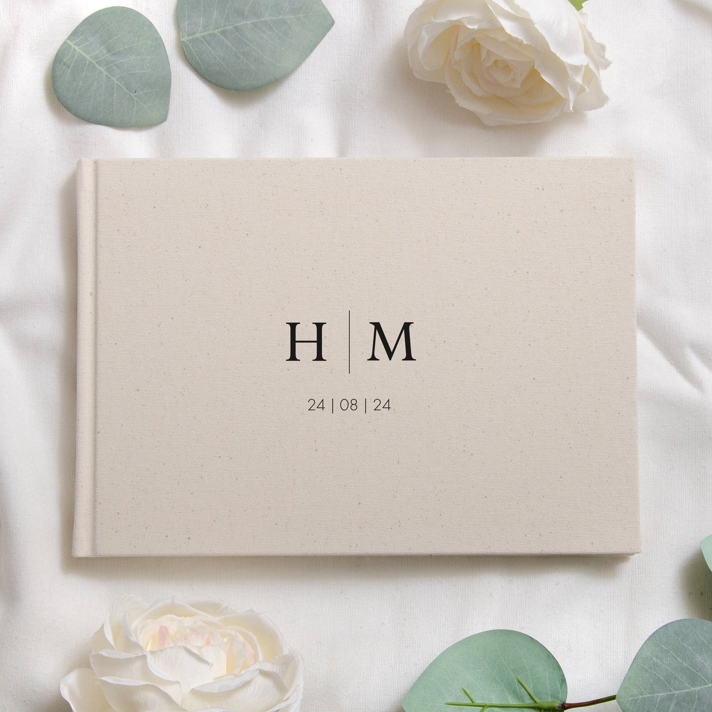 This personalised linen guestbook is a timeless keepsake, featuring custom print of two initials and a wedding date on the front. With its elegant linen cover, both front and back, it offers a perfect way to preserve your guests’ messages, best wishes, and memories for years to come.